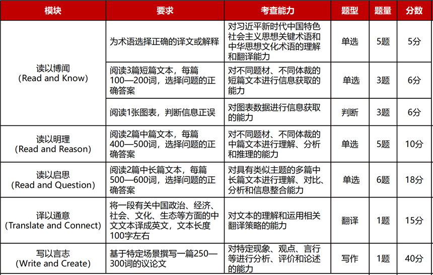 比赛赛题卷面总分为100分,时间共90分钟,题型包含阅读、写作、翻译。