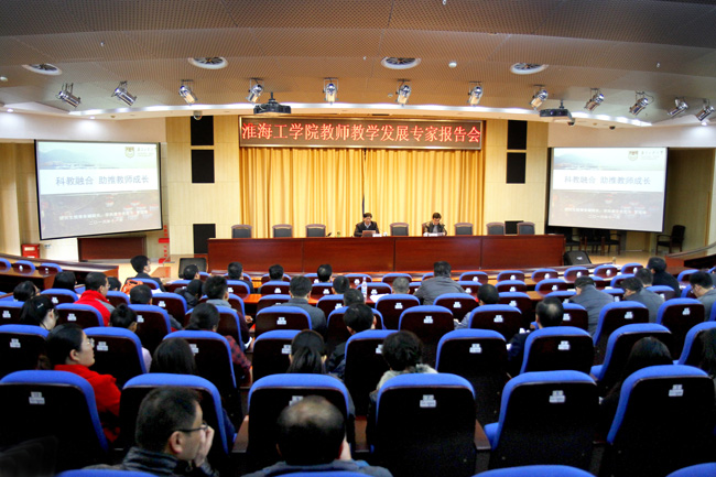为进一步加强学科建设,推进教师教学能力提升,切实保障和提高应用型本科人才培养质量,11月11日下午,由教务处(教师教学发展中心)主办的教师教学发展专题报告会在校会议中心黄海厅举行,邀请省级教学名师、南京工业大学研究生院常务副院长、学科建设处处长管国锋教授作了题为《科教融合,助推教师成长》的专题报告。报告会由教务处处长、教师教学教学发展中心主任李纪明主持,各二级学院及相关部门负责人、专业负责人、连云港市部分兄弟院校的领导和老师参加了报告会。