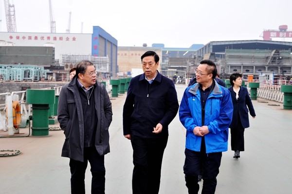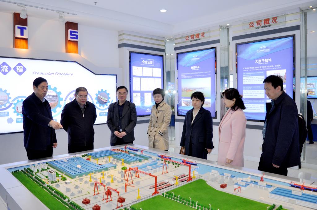 3月31日下午,江苏新时代造船有限公司公司副董事长朱炳康陪同王自力一行参观船舶建造现场及企业展厅。