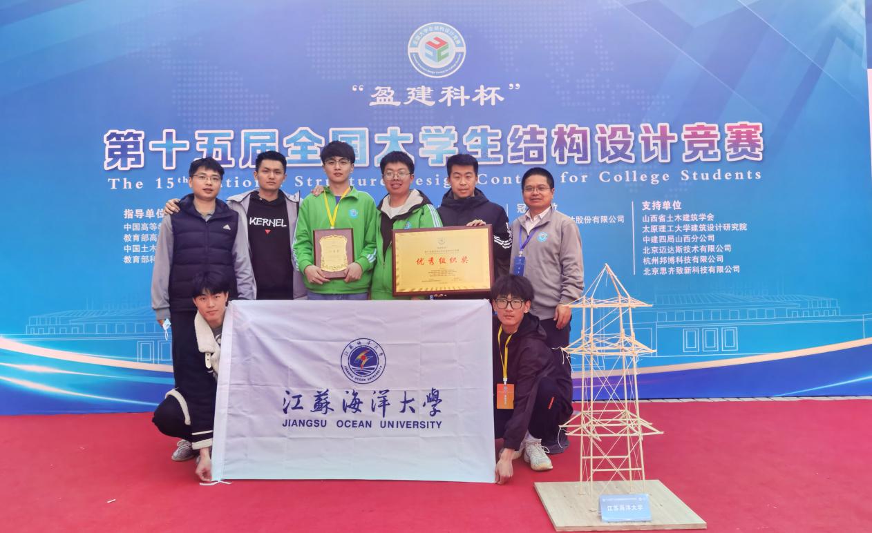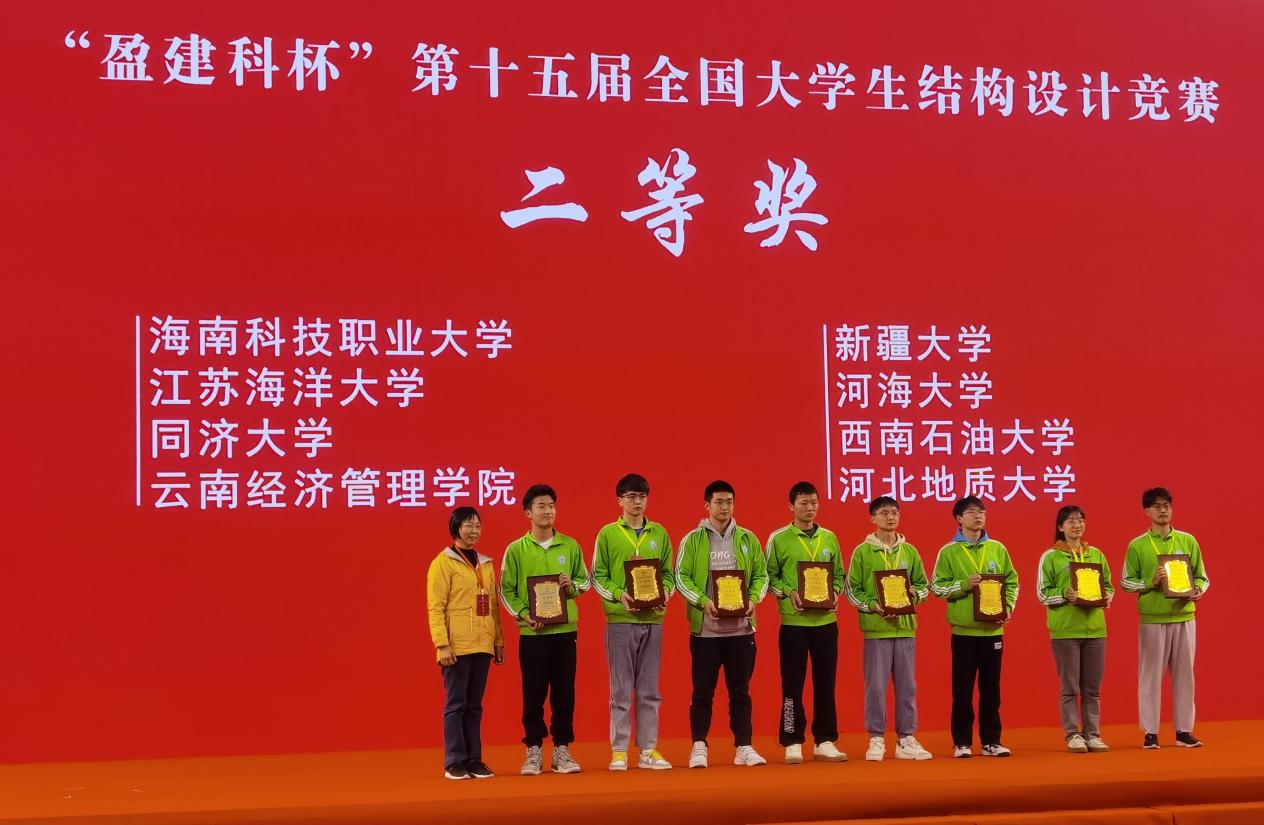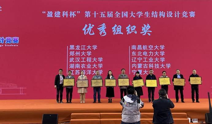 本届大赛题目模型基于“应县木塔”背景,以三重木塔结构为基本单元,要求参赛者在16小时内针对竖向荷载、扭转荷载及水平荷载等多种荷载工况下的空间结构进行受力分析、模型制作及加载试验。我校土木与港海工程学院代表队以四柱压杆为框架结构主体,利用挑檐拉条加强节点抗拉强度、抗扭压杆加固等技术,运用插销装配式节点承受剪力和拉力。经过方案论证、规避检验、现场陈述及加载试验等环节,我校代表队最终在111支参赛队伍中喜获全国二等奖,同时我校荣获竞赛委员会优秀组织奖。这是我校在土木专业类竞赛中获得的最高荣誉。