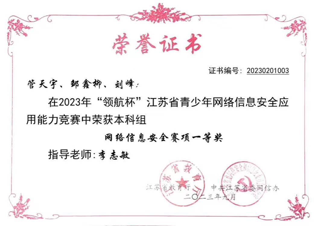 近日,由江苏省教育厅、江苏省委网信办举办的2023年“领航杯”江苏省青少年网络信息安全应用能力竞赛(高校组)决赛在南京开赛,由我校计算机工程学院李志敏老师指导的管天宇、邹鑫柳、刘峰三位学生荣获一等奖。