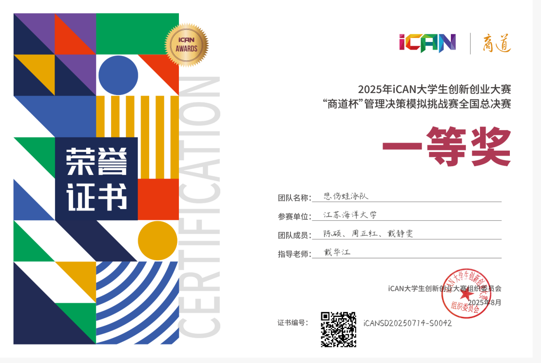 近日,2025年iCAN大学生创新创业大赛“商道杯”管理决策模拟挑战赛全国总决赛在黄山学院举行,我校学子获全国一等奖1项,二等奖2项。